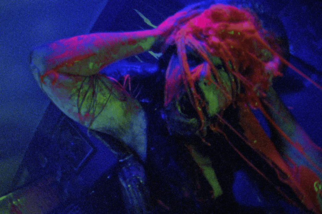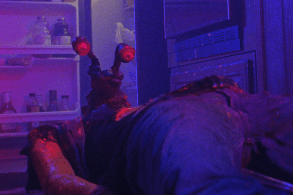 The concept of extraterrestrial contact itself is hardly new, but Begos’ approach—blending paranoia with themes of broken relationships and the destructive allure of substance abuse—brings fresh energy. The entire story plays out in a confined space, almost exclusively within an apartment, which enhances the claustrophobia and absurdity of the situation. Begos used his own apartment, which he and his crew had years to customize for the shoot, and the authenticity of that space gives the film a lived-in quality that adds to the immersion. Shot on 16mm, the result is claustrophobic, chaotic, and absurd in equal measure—and all the better for it.